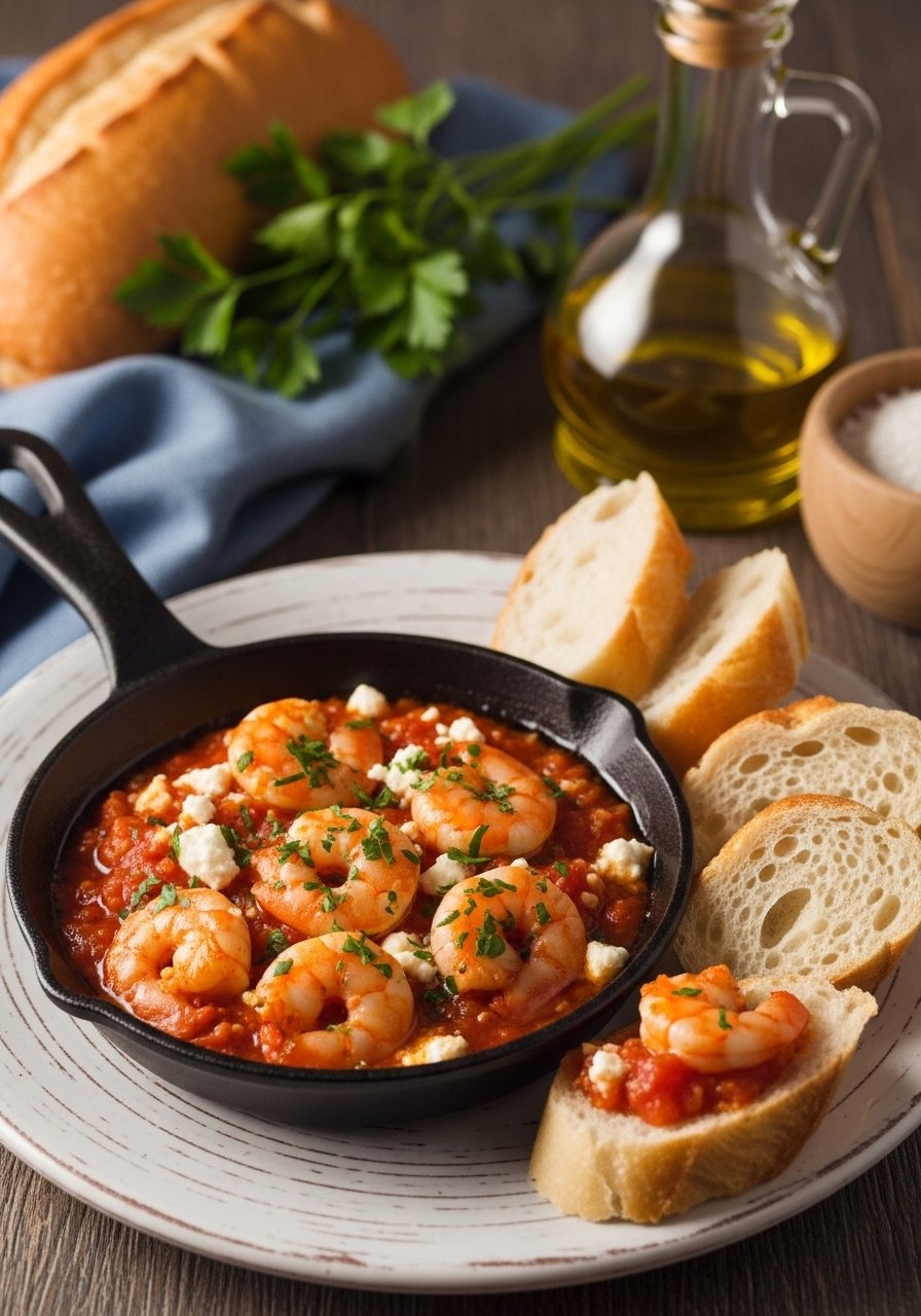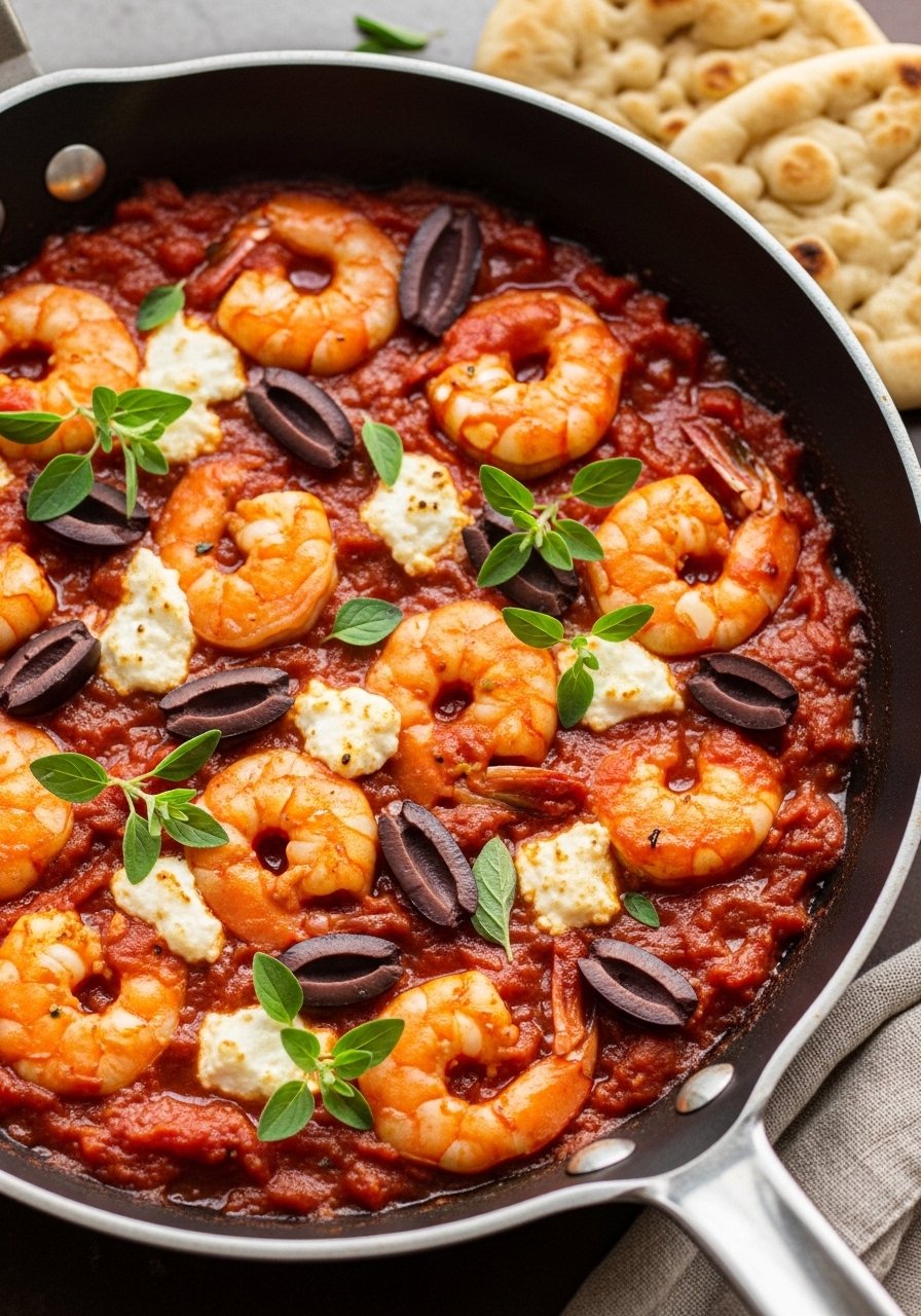 A tangy tomato sauce with crumbled feta and tender shrimp—serve with crusty bread for dipping into the bright, savory sauce.