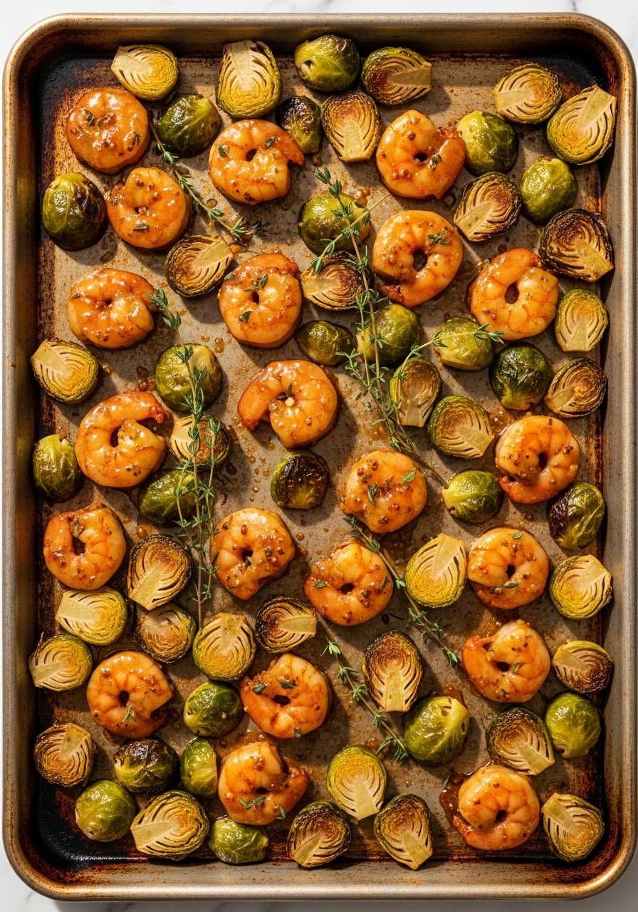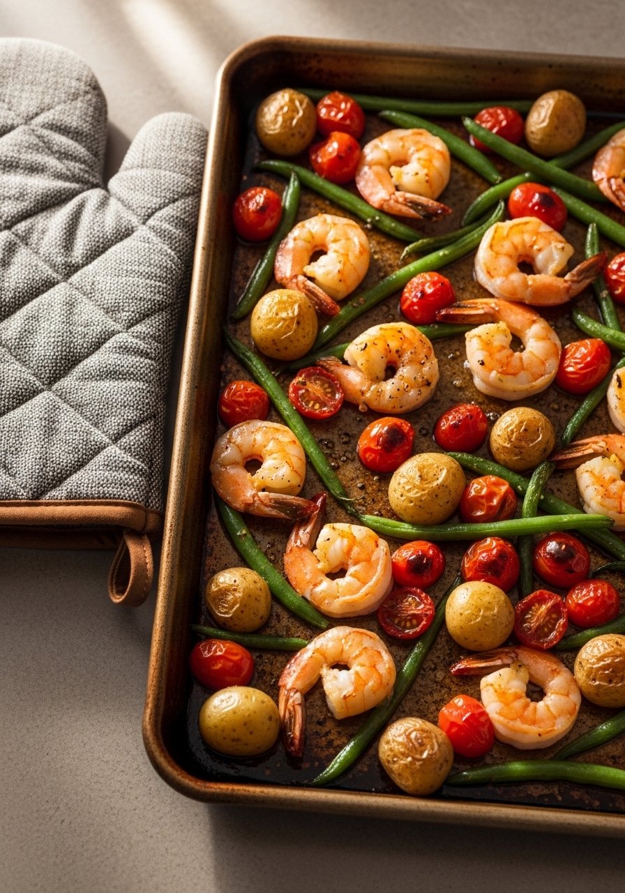 - Add Shrimp: Toss shrimp with remaining oil and seasoning; add to pan and roast 6–8 minutes until opaque.