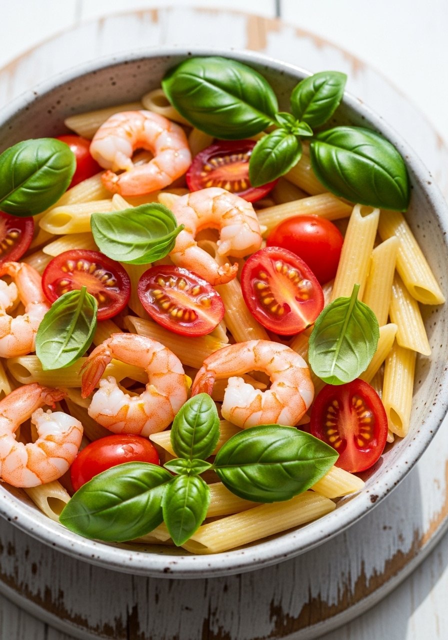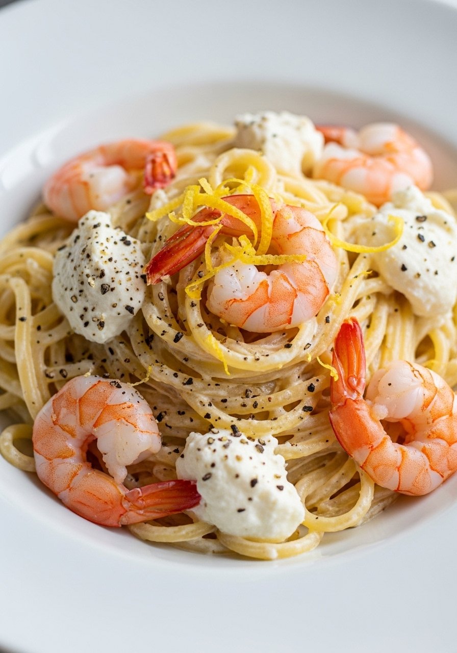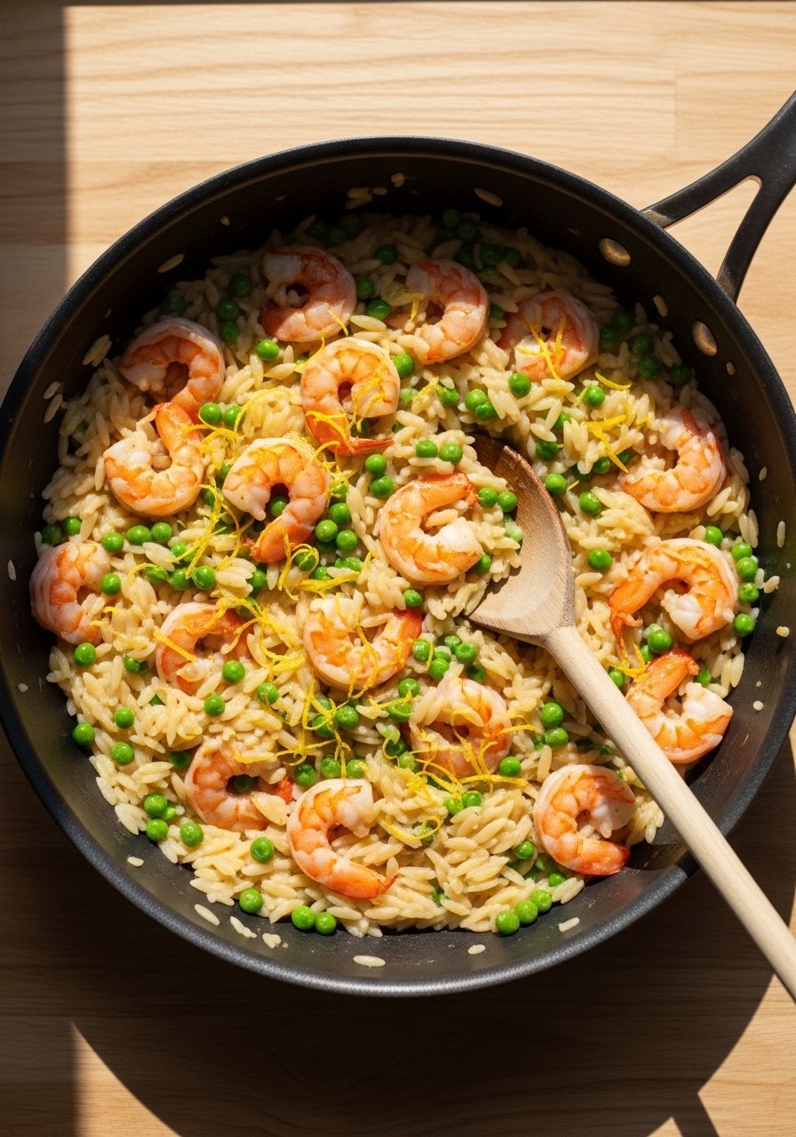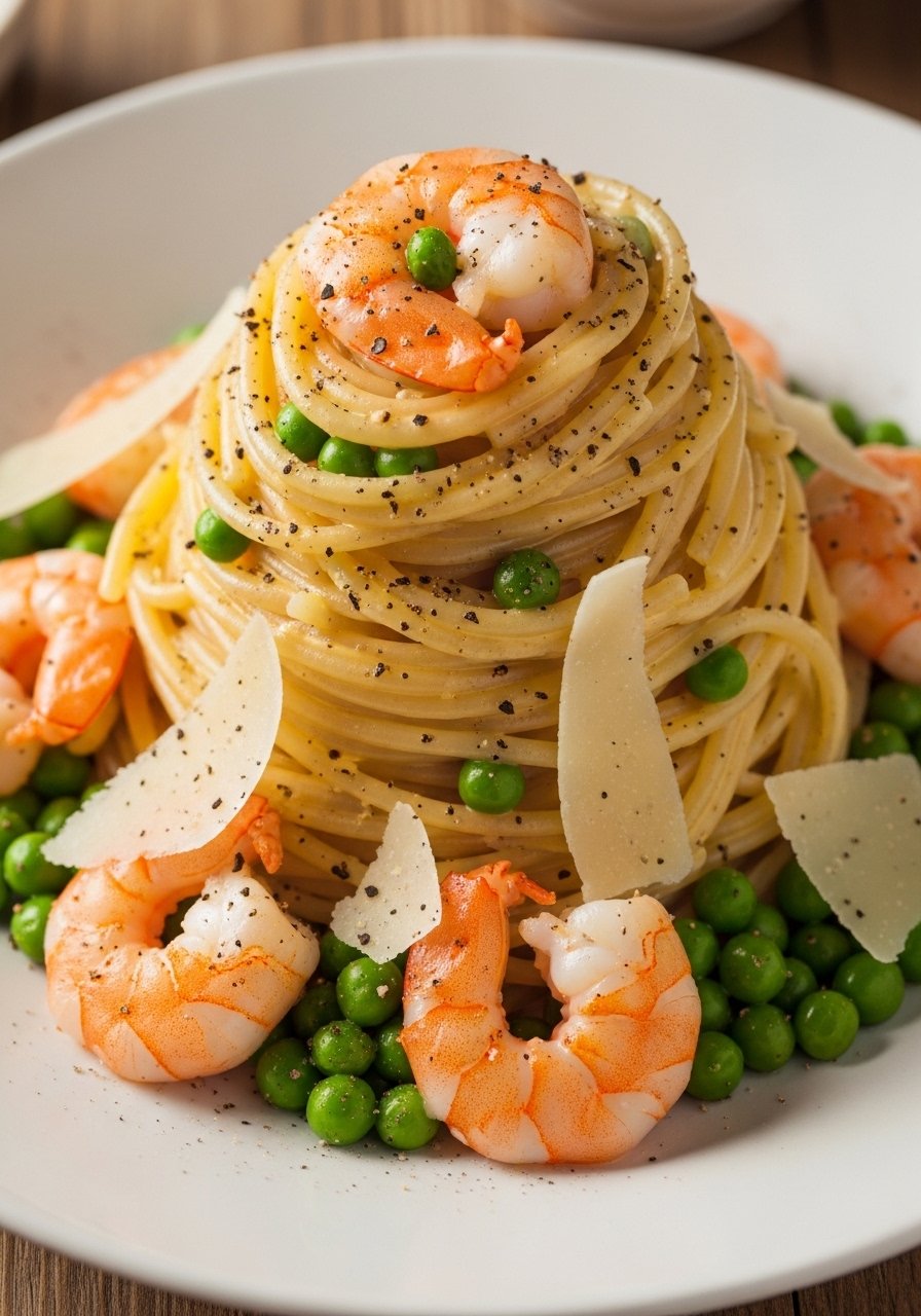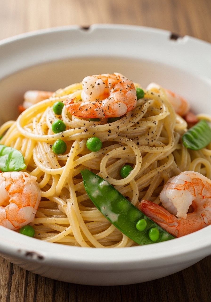 - Combine Off Heat: Toss hot pasta with egg mixture quickly, adding pasta water to create a silky sauce, then fold in shrimp and peas. Season and serve.