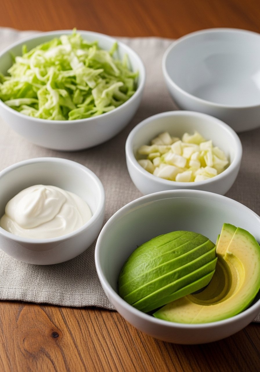 - Make Slaw: Mix cabbage, mayo, lime juice, and a pinch of salt in a bowl; chill briefly.