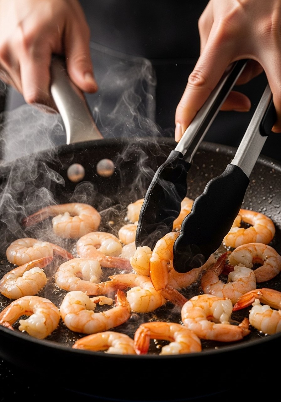 - Cook Shrimp: Heat oil, cook shrimp 1–2 minutes per side until opaque; remove.