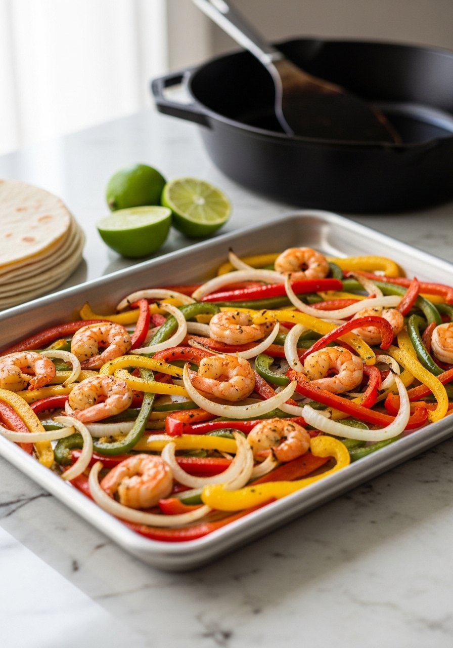 Sheet pan dinners keep cleanup simple. Peppers caramelize while shrimp cook quickly—serve with warm tortillas and salsa for a quick fajita night.