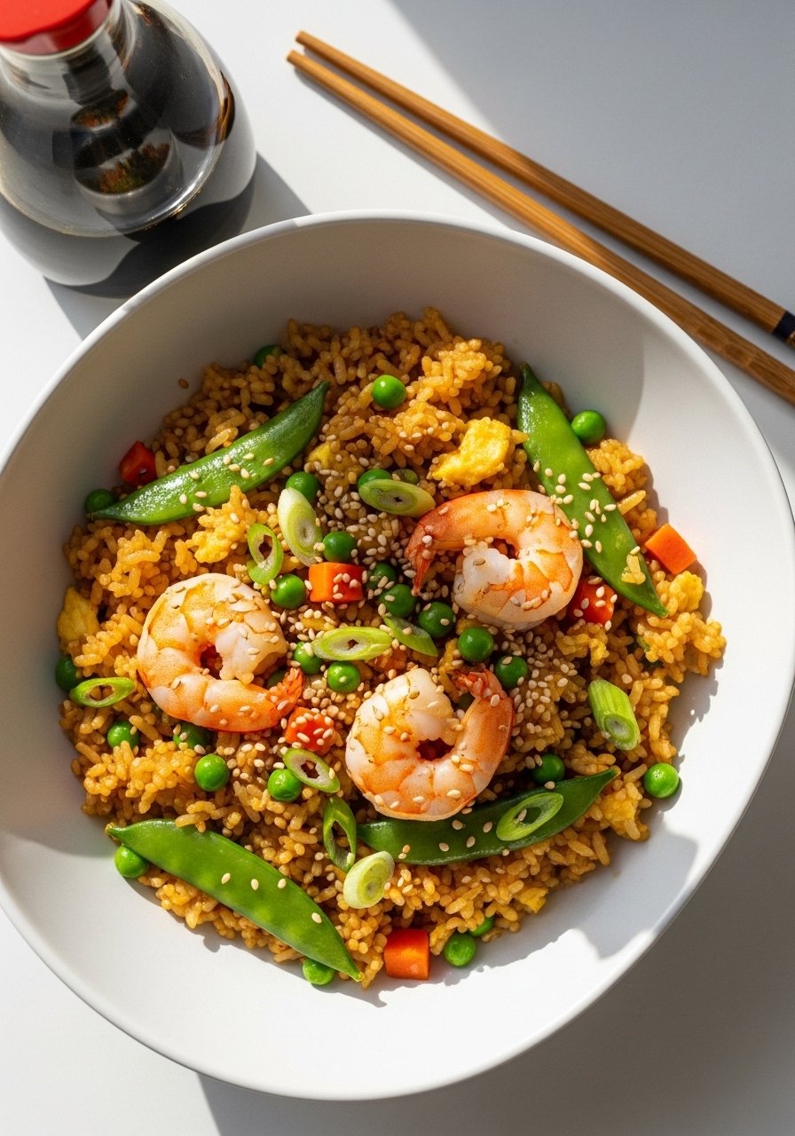 - Fry Rice: Increase heat to high, add rice and veggies, stir-fry 3–4 minutes. Add soy sauce, sesame oil, eggs, shrimp, and scallions. Toss and serve.