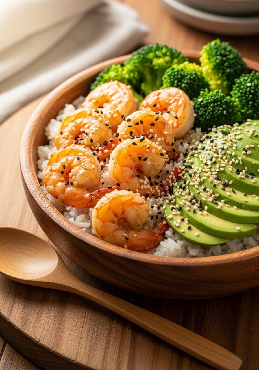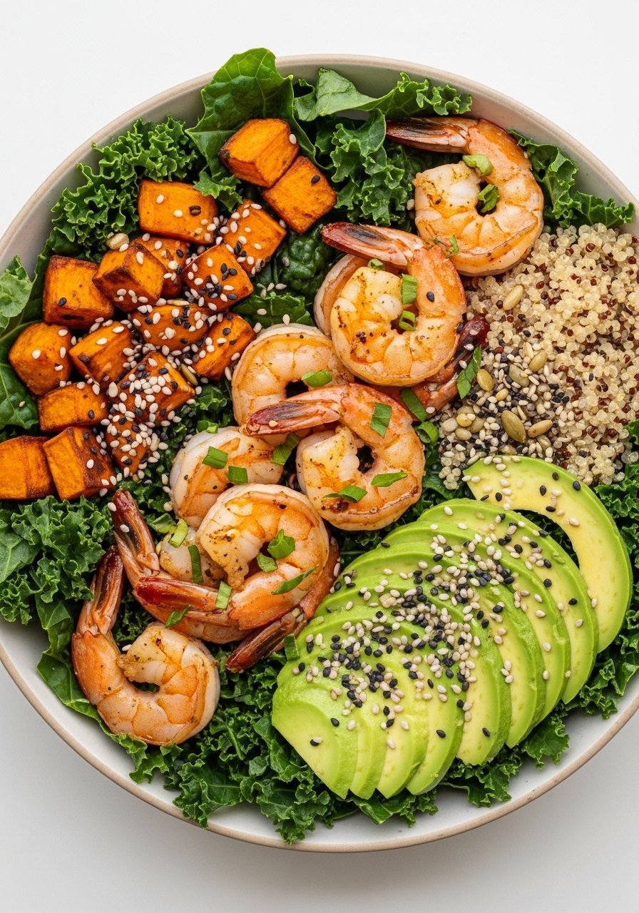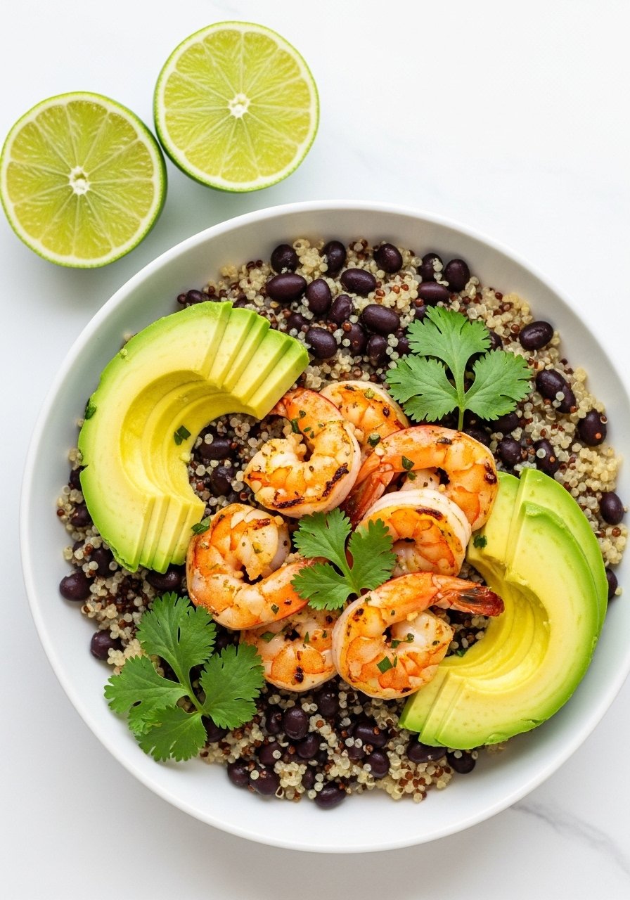 - Assemble Bowls: Layer quinoa, beans, shrimp, and avocado. Garnish with cilantro.