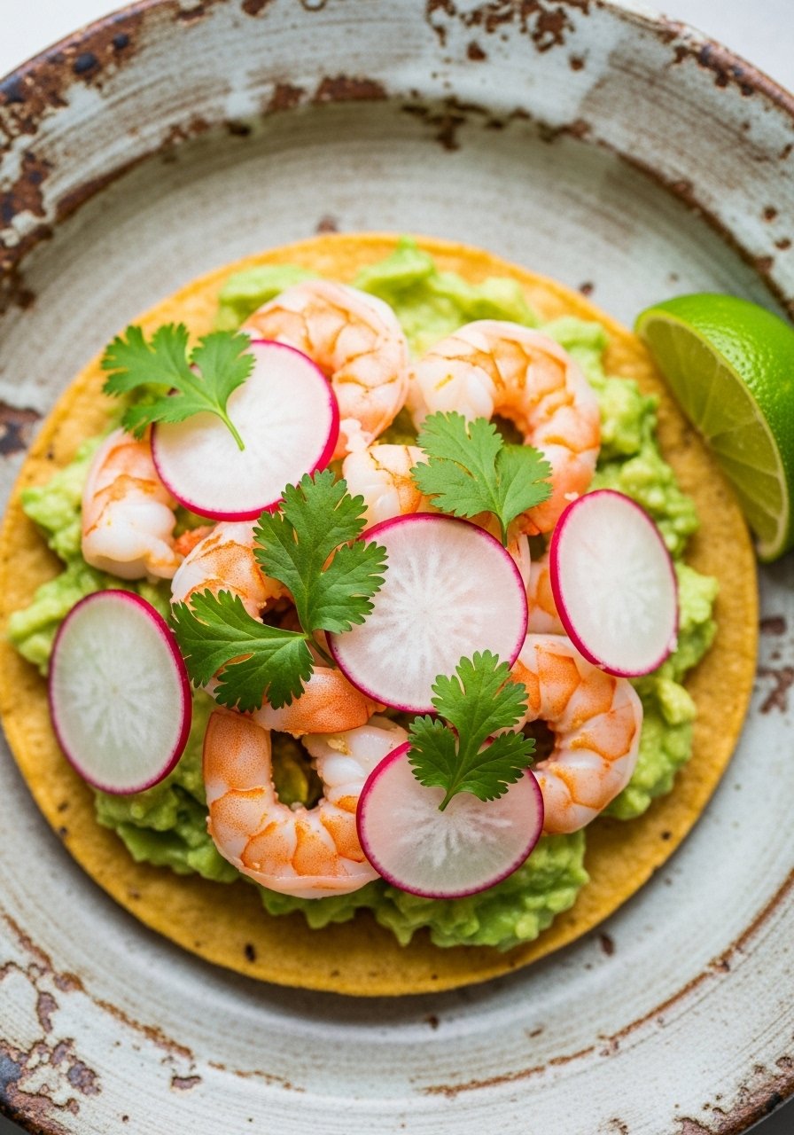 - Assemble Tostadas: Spread avocado on shells, top with shrimp, radish, and cilantro.